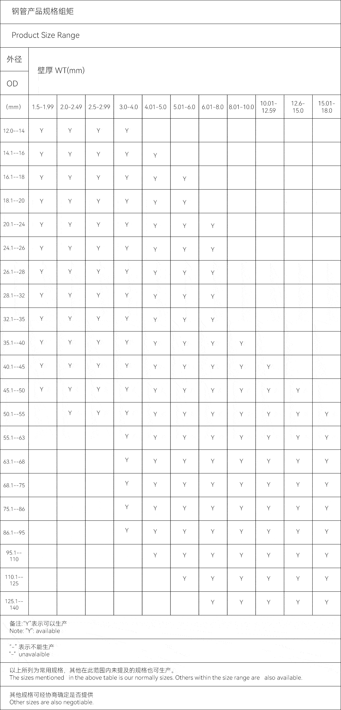 鋼管產(chǎn)品規格組矩Product Size Range外徑壁厚 WT(mm)OD(mm)1.5--1.992.0--2.492.5--2.993.0--4.04.01--5.05.01--6.06.0...